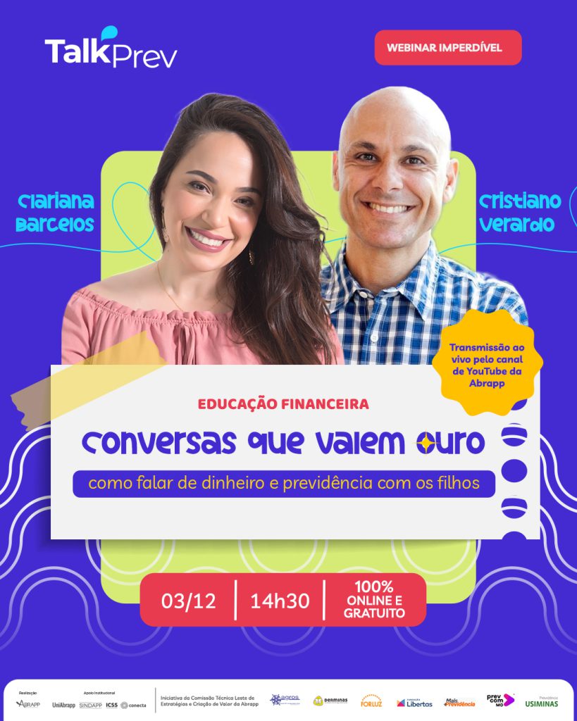 Como ensinar crianças e adolescentes a lidar com o dinheiro e entender o valor de planejar o futuro? Essa é a proposta do TalkPrev 2025. Com o tema “Conversas que valem ouro: como falar de dinheiro e previdência com os filhos”, o evento é gratuito e será realizado no dia 3 de dezembro (quarta-feira), às 14h30, em formato 100% on-line, com transmissão pelo canal da Abrapp no YouTube.